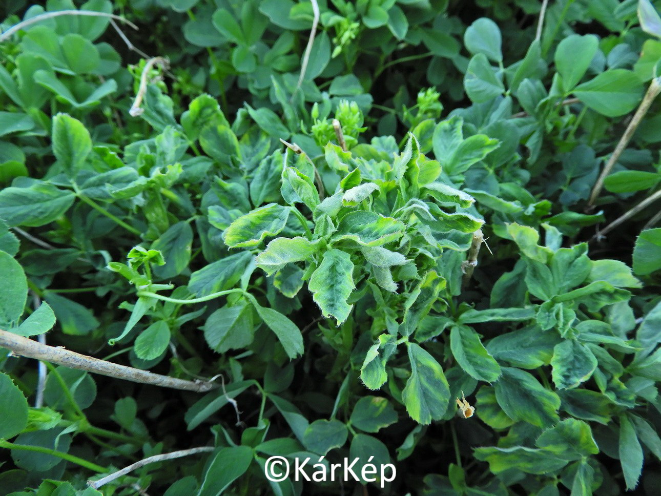Lucerna mozaik vírus (AMV) tünetei a lucernaállományban.