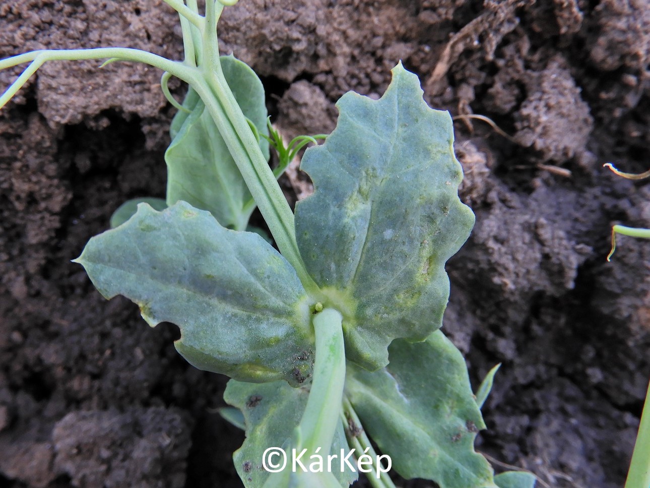 Csipkézőbarkó (Sitonia-fajok) kártétele, a jellegzetes karéjozó rágás a borsó levelein.