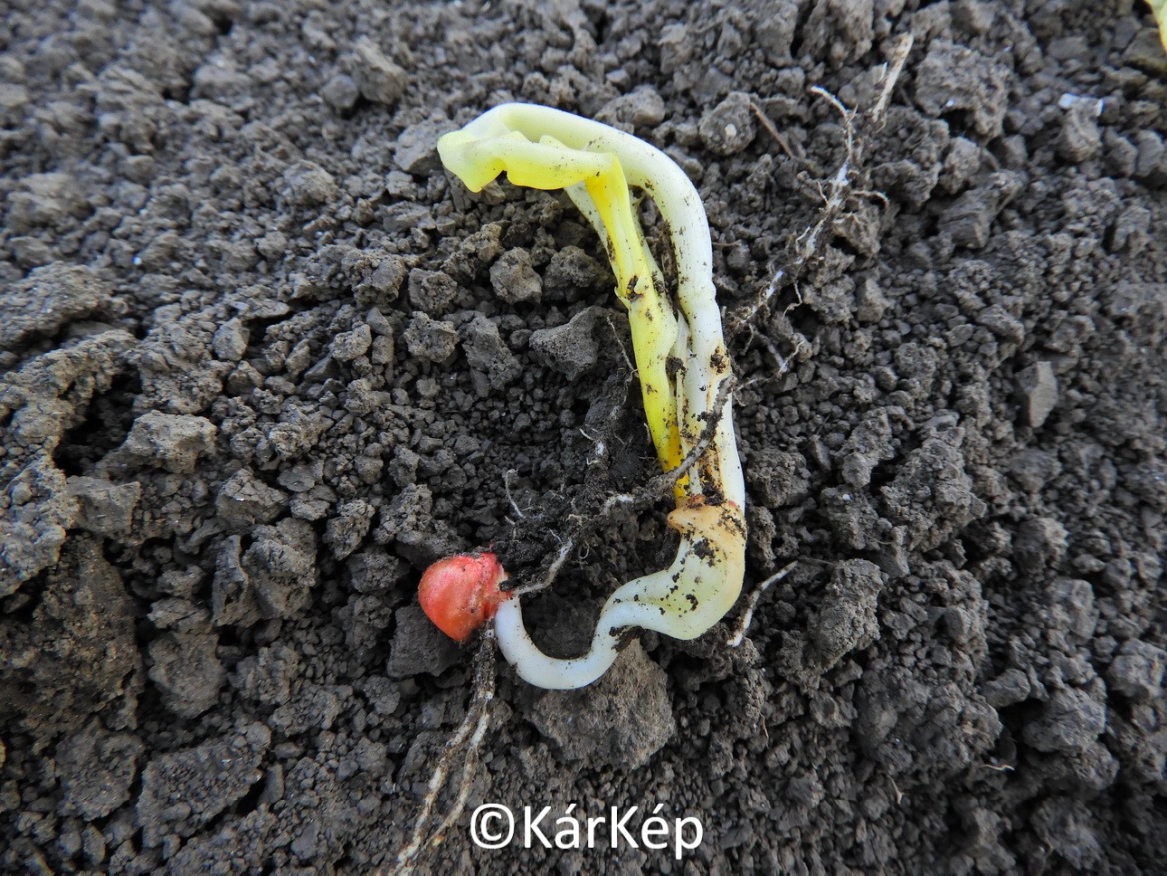 Klóracetanilid típusú gyomirtó hatóanyag által kiváltott fitotoxicitás a kukorica csíranövényen. Bár a jelenség leginkább nagy mennyiségű csapadék hullásakor és hideg talaj esetén léphet fel, a szemlézett területen ezen a száraz tavaszon is megmutatkozott egyes növényeken. A területen egy alkalommal egy keskeny sávban intenzív csapadékhullás történt, ami a száraz, rögös talajon kiválthatta a hatóanyag lemosódását a csírázási zónába. További képek a "Bővebben" gomb megnyomása után láthatók.