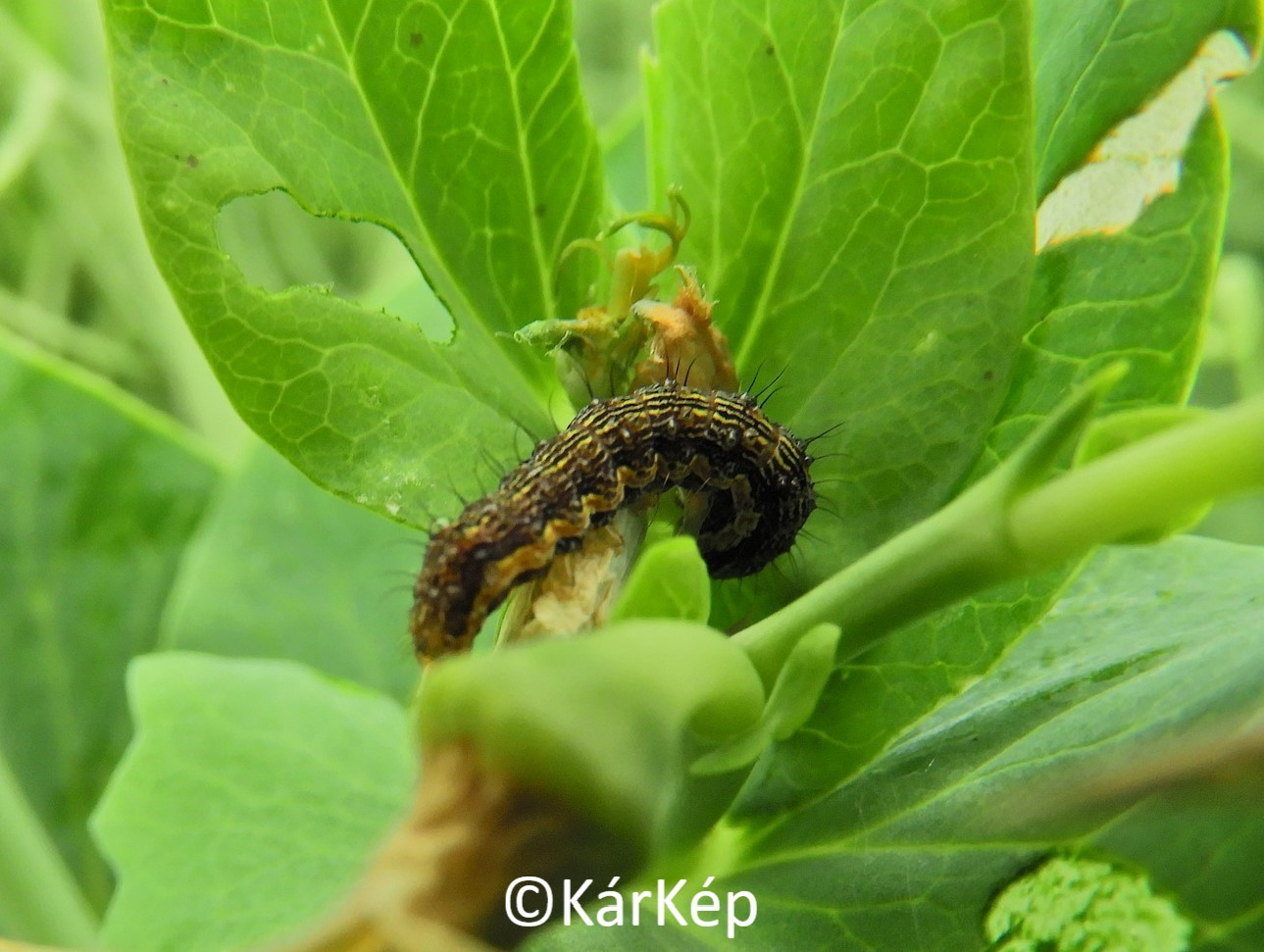 Nagyon-nagyon korai megjelenése a gyapottok-bagolylepkének (Helicoverpa armigera) borsón. A kártevő itthon telelő egyedei báb alakban telelnek át, a délről érkező egyedek pedig még nem érkeztek meg, így érthetetlen, hogyan tudtunk megtalálni már május legvégén (2-3 kép), illetve június elején (1-4-5 kép) ilyen fejlettségű hernyókat. További képek a "Bővebben" gomb megnyomásával érhetők el.