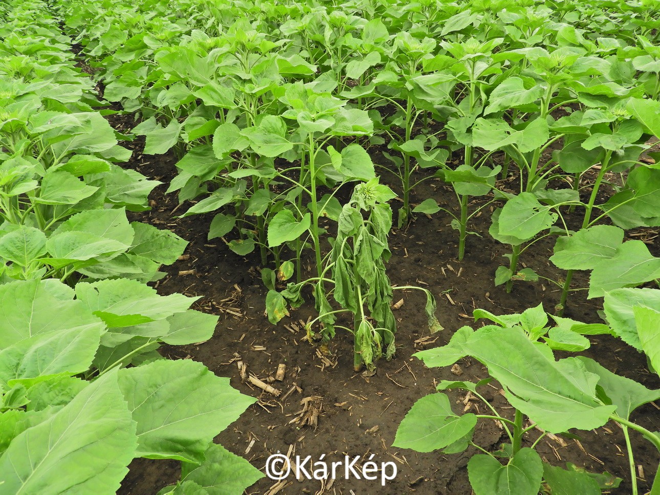 Már megtalálhatók az első fehérpenészes szár- és tényérrothadással (Sclerotinia sclerotiorum) fertőzött napraforgótövek.  A vízzel telített talajokon bizonyára egyre több ilyen lankadó, turgorát vesztett növény lesz, amelyeket ez a kórokozó betegített meg a talajokban található szkleróciumaiból.