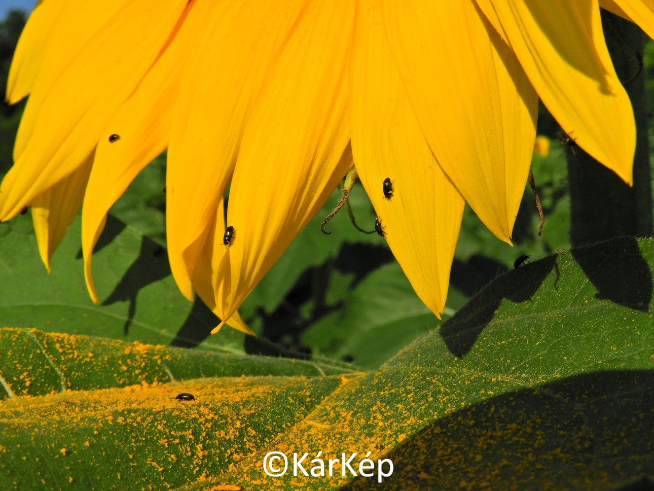 Az első bevirágzott napraforgó-tányérokon sok repcefénybogarat (Meligethes aeneus) találhatunk. Bár helyenként kifejezetten nagy számban vannak jelen, csupán a virágport fogyasztják, így kárt nem okoznak.