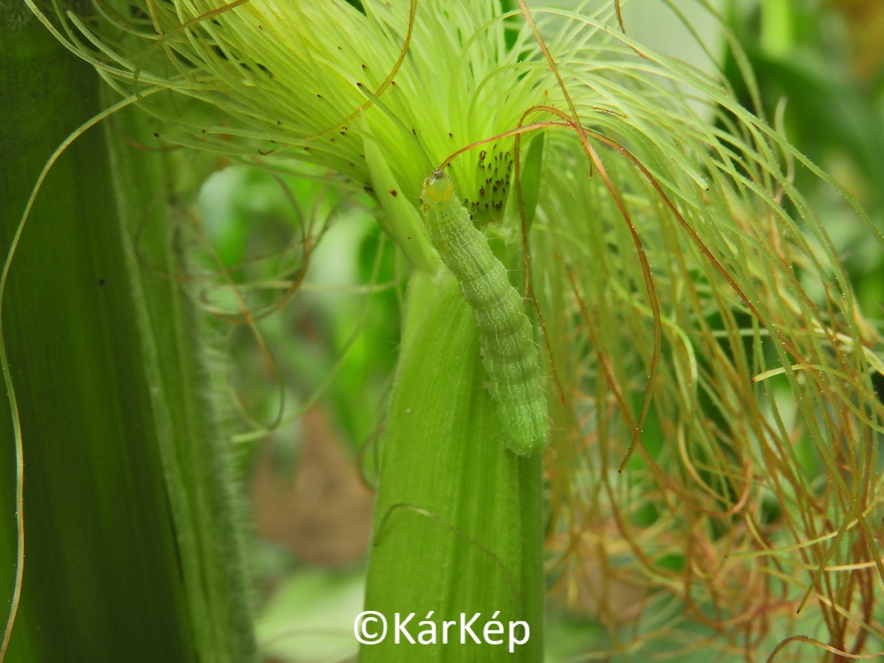 Gamma-bagolylepke (Autographa gamma) kártétele kukoricán. A kártevő polifág, sok tápnövényen képes megélni, viszont a kukoricán való károsítása ritka. Jól látható, hogy kártétele egyelőre a bibék megrágására korlátozódott.