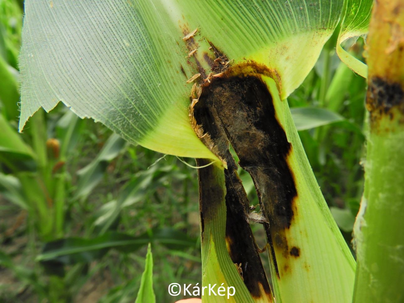 A kukoricaszáron, a szárat ölelő levélhüvelyen gyakran találkozhatunk sötét, barnás, lilás vagy éppen feketés színű folttal. Ezeket a levélhüvelybe hulló, ott felhalmozódó virágporon, portokon, szerves törmeléken megtelepedő és felszaporodó baktériumok és szaprofita gombák okozzák. Bár a levélhüvelyen előfordulhatnak szöveti elhalások, a tünetek a szár belső szöveteire nem terjednek át, így különösebben nem veszélyeztetik a növényt. A tünetekről még több kép látható a "Bővebben" gombra kattintva.