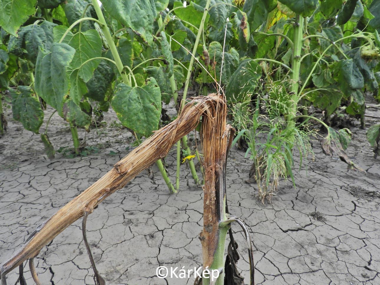 Fehérpenészes szár- és tányérrothadás (Sclerotinia sclerotiorum) fertőzése következtében meggyengült, majd a tányér súlya miatt eltörő szárú napraforgó. A táblákon ezen a tüneten kívül már szépen látszanak a tányérfertőzés nyomai is. További képek a "Bővebben" gomb megnyomásával érhetők el.