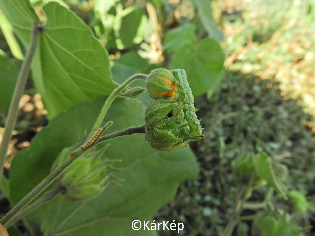 A gyapottok-bagolylepke (Helicoverpa armigera) soktápnövényű faj, számtalan növényen képes kifejlődni, akár gyomnövényeken is. Itt most selyemmályván találtuk meg a hernyókat, amint szokásukhoz híven a generatív részeket károsítják, a bimbókat, a virágokat és a terméseket. Még több kép látható a "Bővebben" gombra kattintva.