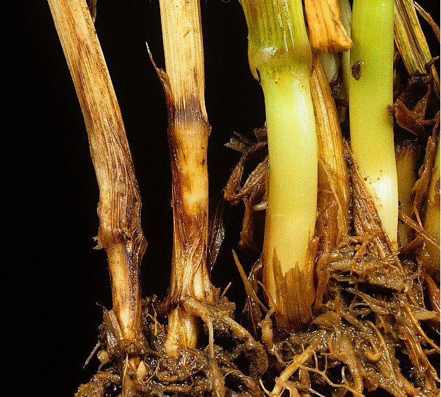 A fuzárium-fajok fertőzése a szárat is érinthetik szártőbetegségek formájában. A szár alsó részén nagy kiterjedésű barna foltok jelenhetnek meg, a szár belsejében piszkosfehér gombaszövedék jelenik meg. A folt nedves időben nyálkásan rothad, azon rózsaszínű penészgyep alakulhat ki. A szár kedvezőtlen esetben eltörik.